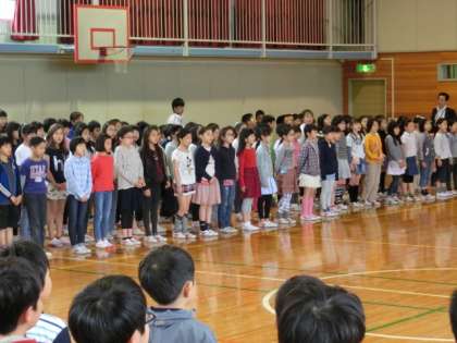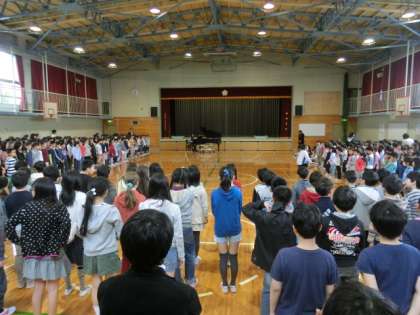 今度の離任式で歌う「さよなら」の歌を全校で練習しました。離任式に参加しない1年生は、上学年の歌を静かに聞きます。