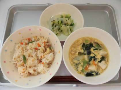 献立 子ぎつねご飯、かきたま汁、野菜の塩昆布かけ、牛乳