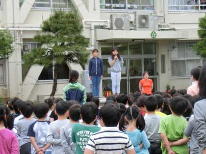 今朝は校長先生から教育実習生の紹介がありました。大学で教員になるために勉強している若い先生です。主に3年1組にいらっしゃいますが、みんな仲良くしてたくさん遊んでもらいましょう。