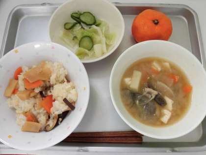 献立 山菜おこわ、豚汁、塩だれキャベツのサラダ、果物(冷凍みかん)、牛乳