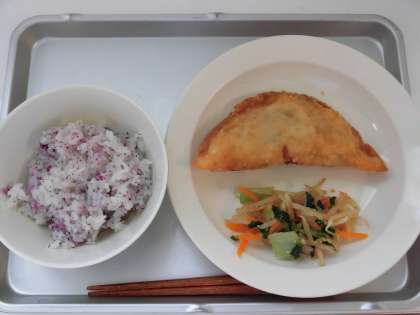 献立 ゆかりご飯、ジャンボぎょうざ、もやしと小松菜のごま醤油、牛乳