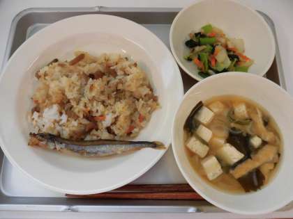 献立 豚肉とごぼうの混ぜご飯、ししゃものから揚げ、野菜のおかか和え、豆腐とわかめのみそ汁、牛乳