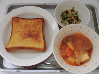 献立 フレンチトースト、トマトシチュー、なんでも千切りサラダ、牛乳
