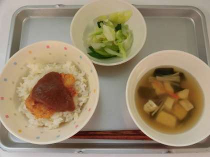 献立 みそカツ元気丼、ひと塩野菜、紅白すまし汁、牛乳