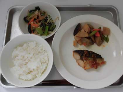 献立 ご飯、さばのねぎソースかけ、五色煮、油揚げ入りお浸し、牛乳