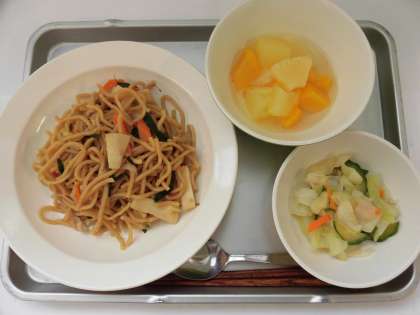 献立 塩焼きそば、野菜の中華甘酢かけ、フルーツポンチ、牛乳