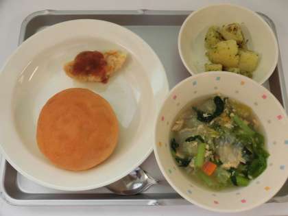 献立 米粉パン、メルルーサのバーベキューソース、じゃが芋の香味和え、レタスと卵のスープ、牛乳