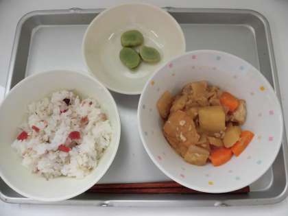 献立 梅じゃこご飯、五目うま煮、そらまめの塩ゆで、牛乳