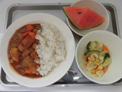 献立 チキンカレーライス、コーンサラダ、果物(小玉すいか)、牛乳
