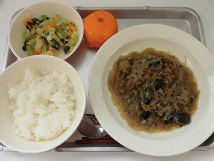 献立 ご飯、なす入り麻婆春雨、中華サラダ、果物(冷凍みかん)、牛乳