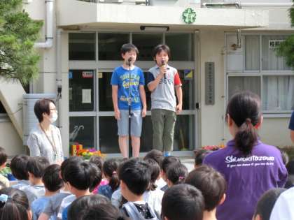 生活当番の先生からは今週の目標、計画委員さんからは先日の代表委員会で決まった児童会のテーマ「ともだち4」の紹介がありました。