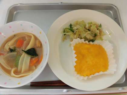 献立 おっきりこみうどん、こんにゃくサラダ、にんじん蒸しパン、牛乳