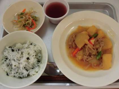 献立 わかめご飯、肉じゃが、もやしの和え物、ぶどうゼリー、牛乳