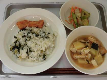 献立 青菜ご飯、いかのかりんと揚げ、アスパラとキャベツのサラダ、じゃが芋のみそ汁、牛乳