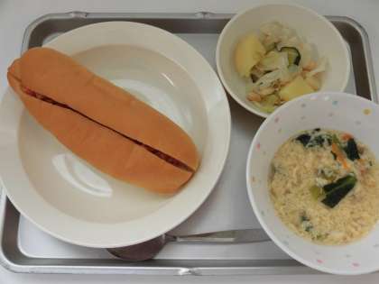 献立 ドライカレーサンド、チーズと卵のふわふわスープ、ポテトと豆のサラダ、牛乳