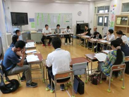 9月の三校合同での研究発表に向け、教育委員会の指導主事や講師の先生にもご指導を仰ぎながら、北沢小、北沢中の先生方と協議を行いました。