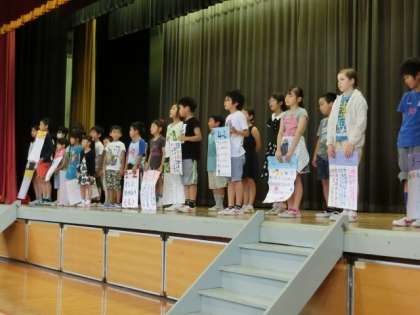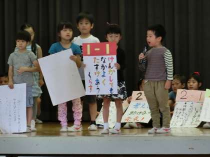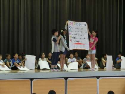 まずは計画委員会から、今年度の児童会テーマ「ともだち4」の説明。その後、各クラスの代表委員・代表児童からクラスのテーマが発表されました。最後に音楽委員の演奏で、「すてきな友達」を全校合唱です。