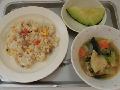 献立 チャーハン、わんたんスープ、メロン、牛乳