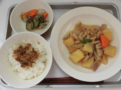 献立 ご飯、ピーマンふりかけ、肉じゃがのうま煮、野菜のゆかり和え、牛乳