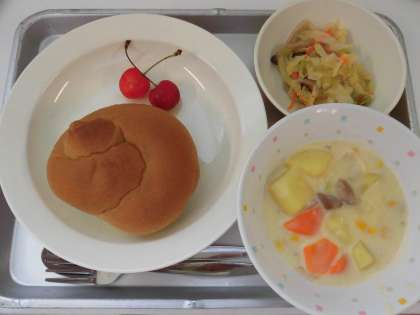 献立 あしたばパン、米粉のコーンシチュー、キャベツときのこのソテー、果物(さくらんぼ)、牛乳