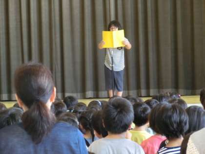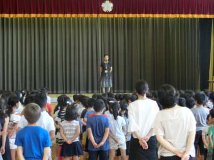 低学年はみんな手を挙げますが、高学年はさびしい感じです。ここで照れたり、自分を過小評価してしまうのは、高学年なら自然なことかもしれません。しかし、これからは国際化の中で生きていくために、この考えを変えていかないと…。自信をもって自分を表現してほしい、1学期、みんなとても頑張りました、と誉めていただきました。