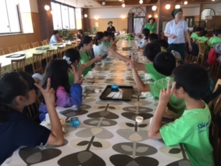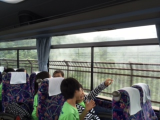 大笹牧場へ向かう途中、キリが…バスの中では、歓声が。お昼を食べて、バター作り体験。上手にできた子がホームページなので、後ろを向いているけれどピース。