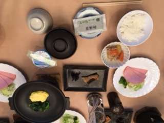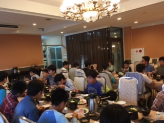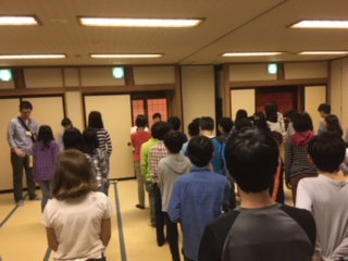 雨が降っています。朝の集いは、室内で。朝食を食べて、宿舎を出発です。