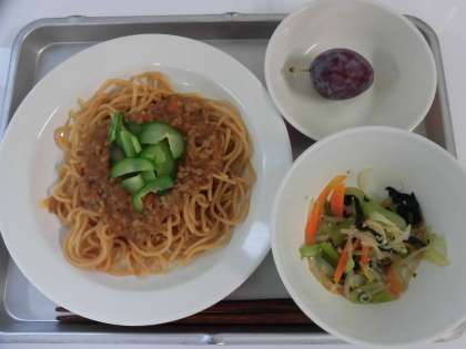 献立 ジャージャー麺、中華サラダ、果物(プルーン)、牛乳