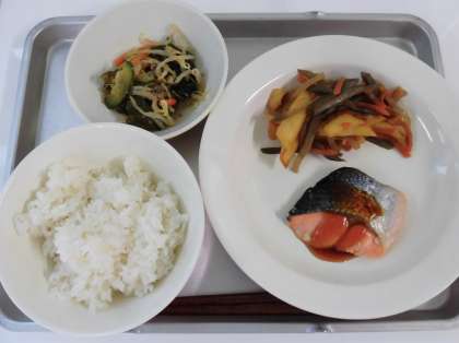 献立 ご飯、鮭のレモン風味、じゃが芋のきんぴら、もやしとわかめの和え物、牛乳