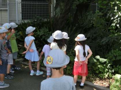 ビオトープのメダカ以外は、なかなか発見できませんでしたが、かすかな虫の鳴き声をたよりに探検は続きます。