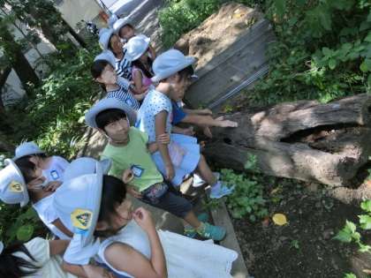 校舎裏にまわると倒木の陰からムカデが出現したり、セミの抜け殻をゲットしたりと探検らしくなりました。