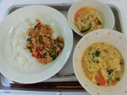献立 ガパオライス、春雨サラダ、卵入り五目スープ、牛乳
