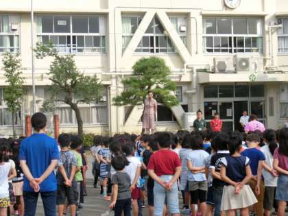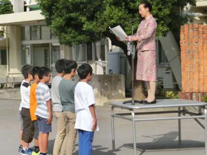 今朝は野球チーム「ヤングフタバ」が地域の大会で敢闘賞をいただいたので、選手の児童たちが校長先生からみんなの前で表彰されました。