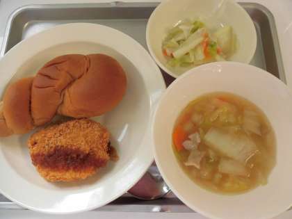 献立 黒砂糖パン、かぼちゃコロッケ、キャベツサラダ、野菜スープ、牛乳