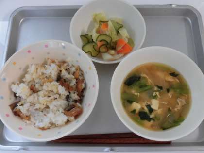 献立 さんまご飯、卵と玉ねぎのみそ汁、キャベツの甘酢和え、牛乳