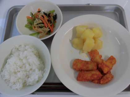 献立 ご飯、いかのチリソース、粉ふき芋、野菜のごま酢和え、牛乳