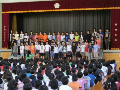 最初は6年生が全校児童の前で「この星に生まれて」を歌ってくれました。すごい声量の歌声を、みんなじっと聴き入っていました。
