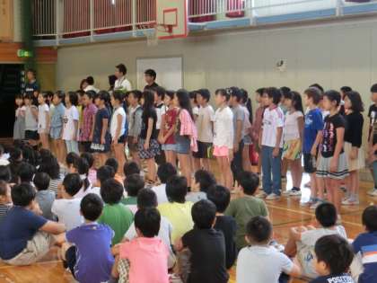 まずは4年生と6年生が低いパートをデモンストレーションで歌って、低学年の子どもたちに聞かせてくれました。