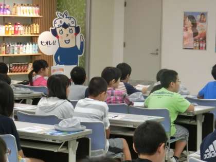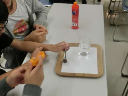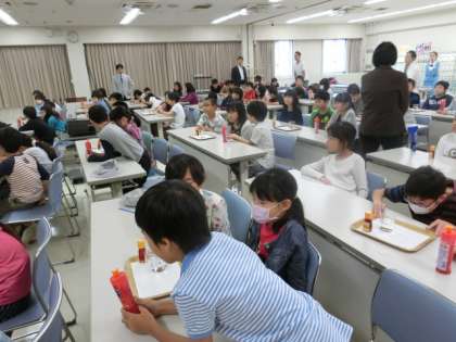 最初の見学先は、毎日の生活に欠かせない洗剤や化粧品などを作っている「花王」の川崎工場です。はじめになぜ洗剤で汚れが落ちるのか、油汚れを落とす実験を通して、その仕組みを教えていただきました。