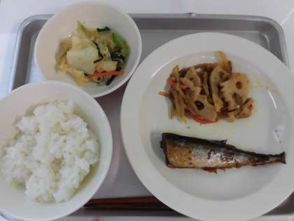 献立 ご飯、さんまのしょうが煮、五目きんぴら、野菜の和え物、牛乳