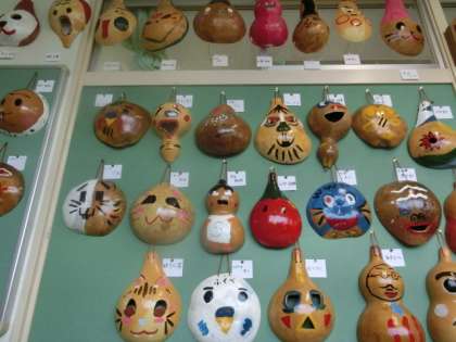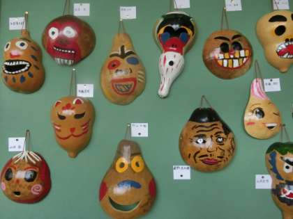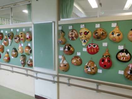 6年生の教室前には、日光移動教室で作ったふくべ細工が展示されています。たくさんの個性的な顔が並んでいますよ。
