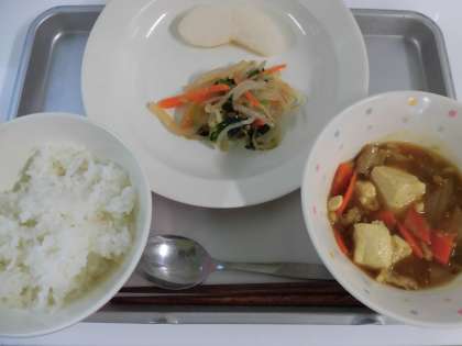 献立 ご飯、豆腐のカレー煮、こんにゃくサラダ、果物(梨)、牛乳
