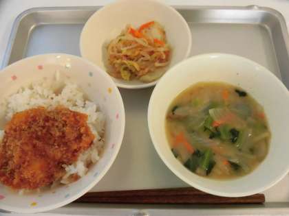 献立 チキンたれかつ丼、白菜のおかか和え、五目みそ汁、牛乳