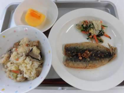 献立 秋の香りご飯、いわしの南蛮漬け、野菜のごまだれかけ、果物(柿)、牛乳