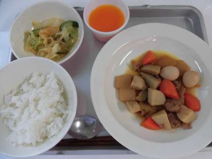 献立 ご飯、うずら卵入り里芋のうま煮、カリカリ油揚げのサラダ、キャロットゼリー、牛乳