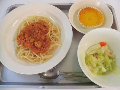 献立 みそミートソーススパゲッティ、キャベツサラダ、かぼちゃのチーズケーキ、牛乳