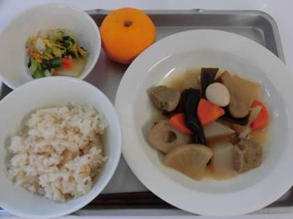 献立 茶めし、おでん、菊入りおかか和え、果物(みかん)、牛乳