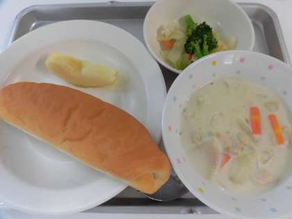 献立 米パン、白いんげん豆のクリームシチュー、ブロッコリーサラダ、果物(洋梨)、牛乳