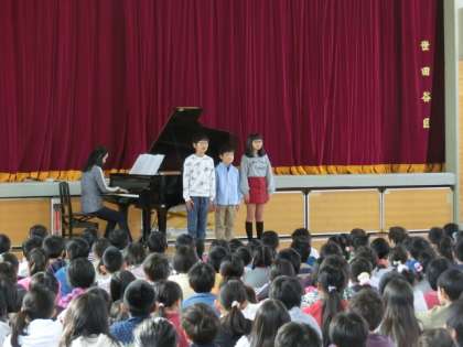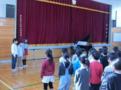 音楽の先生から「みんなで1つのメロディーを歌うことを"斉唱"と言い、一人で歌うことを"独唱"と言います」というお話があり、独唱とはどういうものか、代表の児童がみんなの前で「千の風になって」を独唱で披露してくれました。この日のために練習をしてきた歌声は、堂々としてすばらしいものでした。