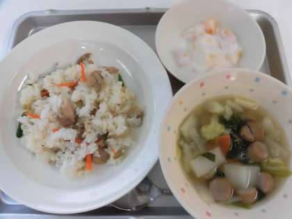 献立 鶏ごぼうピラフ、ウインナーと野菜のスープ煮、フルーツヨーグルト、牛乳